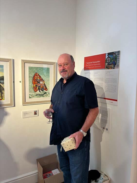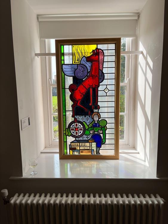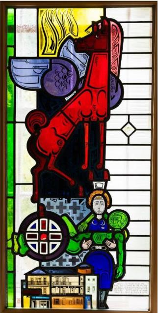 Y gwydr panel lliw syfrdanol o waith Paul-Franz Bonnekamp 'Y Samariad Hanesyddol' ar fenthyciad caredig gan Fwrdd Iechyd Prifysgol Betsi Cadwaladr
