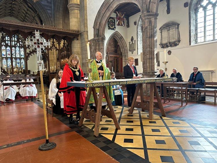 Maer Bangor Elin Walker Jones a Dirprwy Faer Soest Christiane Mackensen yn Arwyddo’r Siarteri Ailgysegru dan oruchwyliaeth Is-Ddeon Cadeirlan Bangor y Canon Sion Rhys Evans.