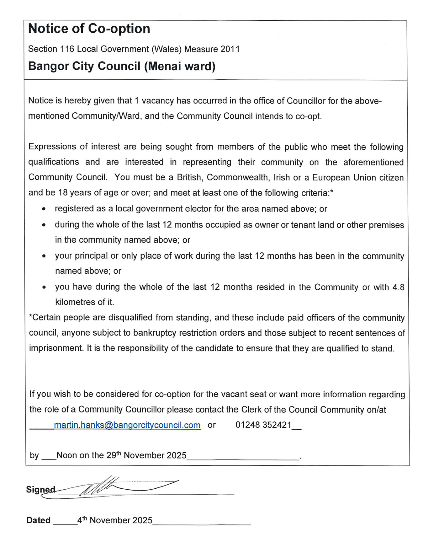 To contact the Councillors by post, please write to: City Council Offices, Ffordd Gwynedd, Bangor, Gwynedd, LL57 1DT